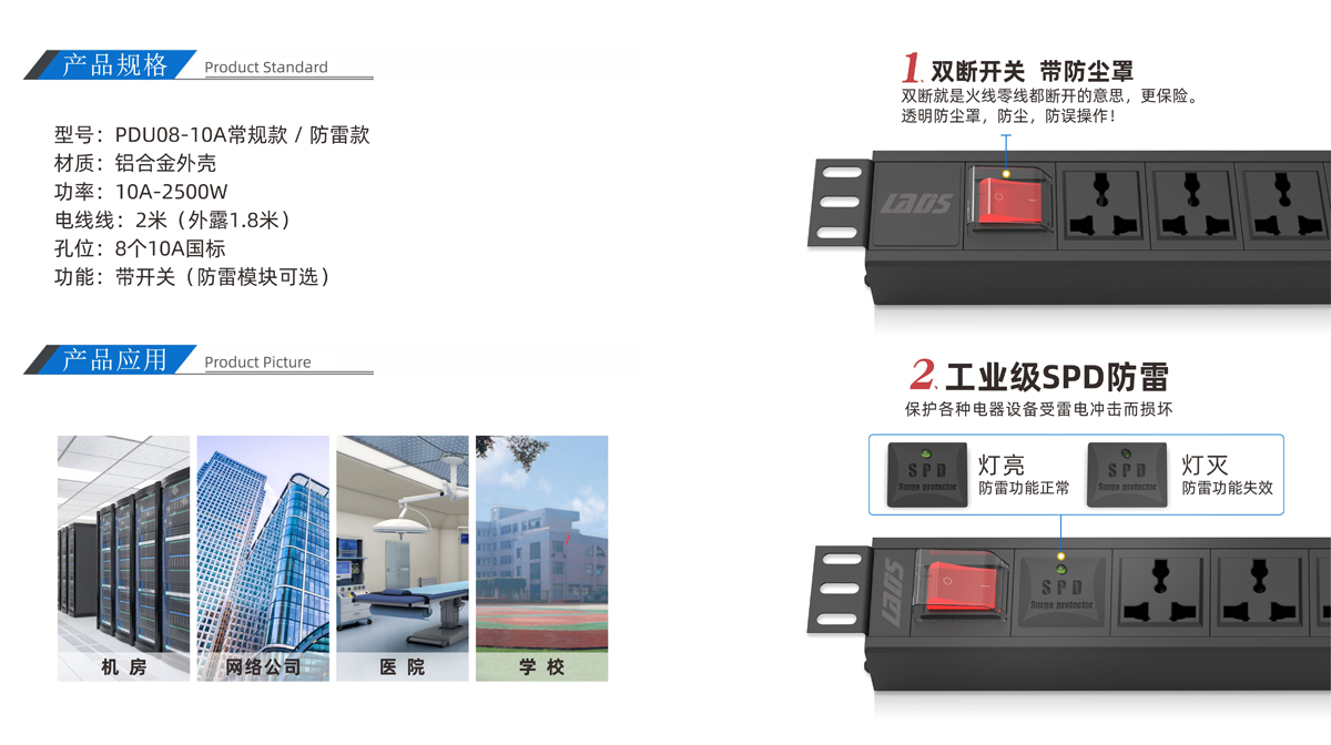 雷迪司 8位萬用帶總控開關(guān)PDU 10A插頭